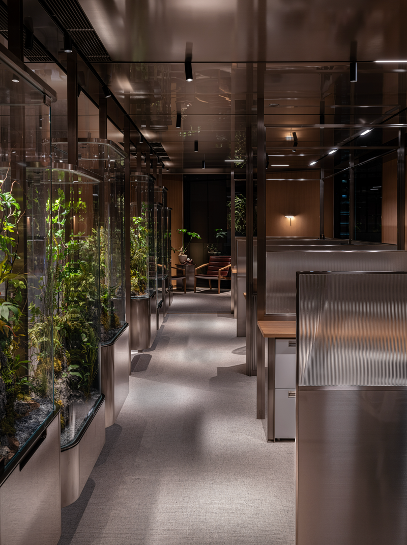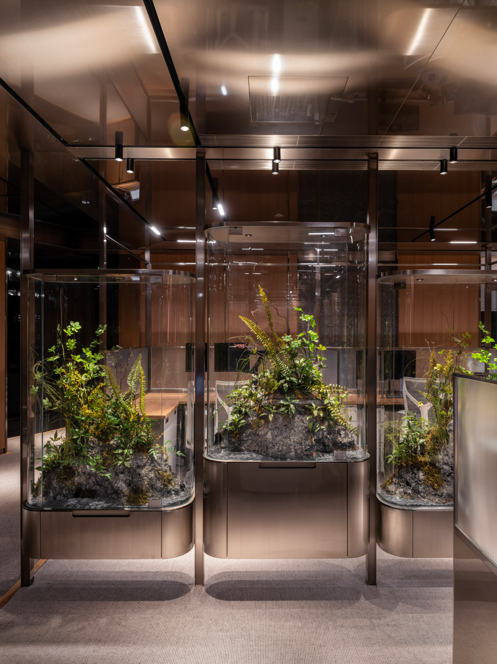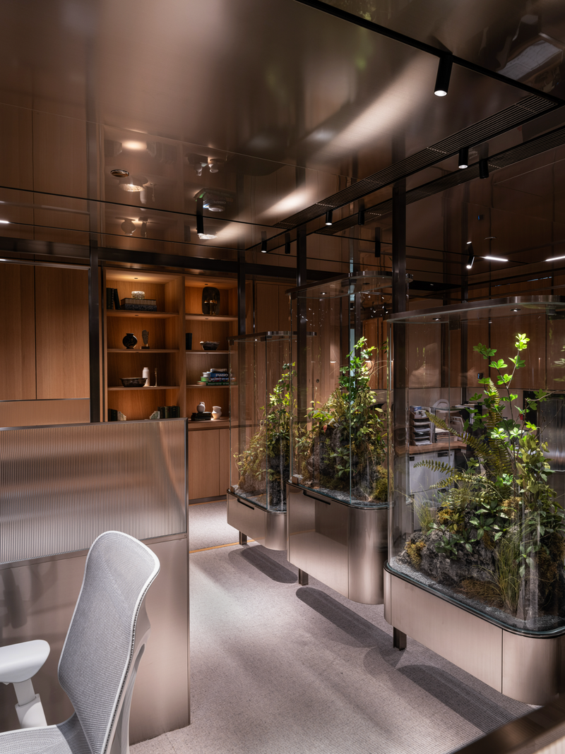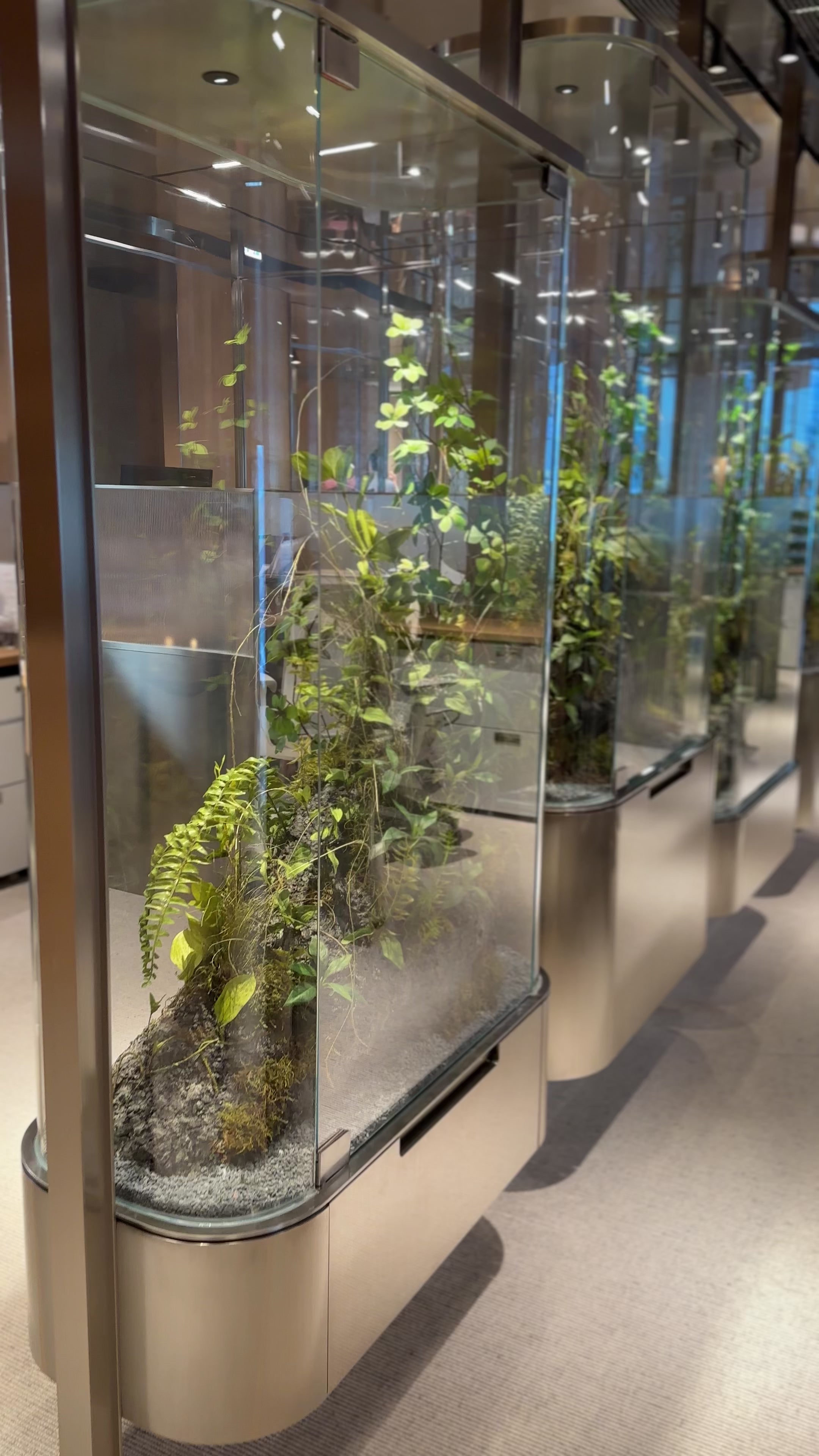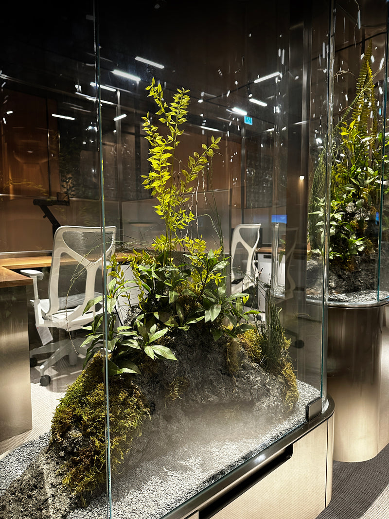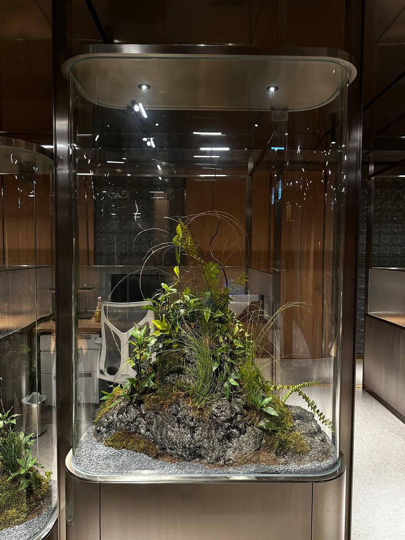 The HPO – Private Client Project: Practical Solutions for a Private Setting. Given the challenges of drainage and condensation in enclosed glass displays, the terrariums were crafted using artificial elements to ensure durability and longevity. As the private office had limited access and ongoing maintenance was not an option, this practical solution allowed for a low-maintenance installation without compromising on aesthetics. The HPO – Private Client project stands as a testament to precision and innovation, delivering a timeless, maintenance-free design that effortlessly mimics the beauty of nature.
